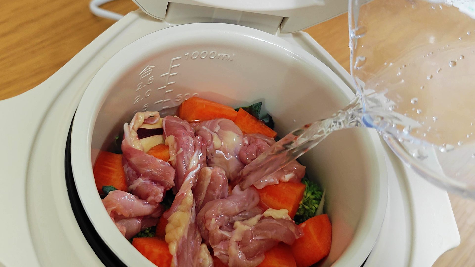 ②炊飯器に具材を入れ、水を注ぐ