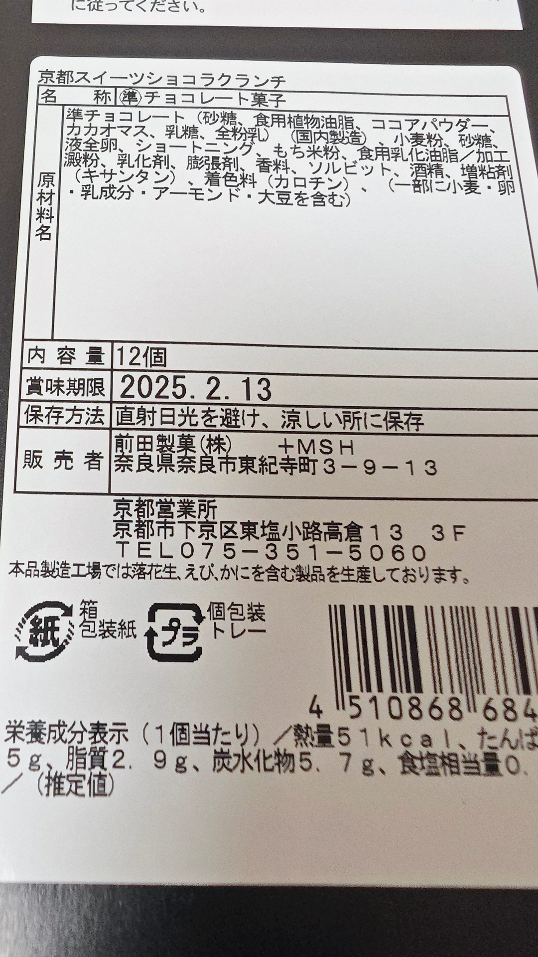 - 前田製菓 京都スイーツショコラクランチ 756円(12個入)